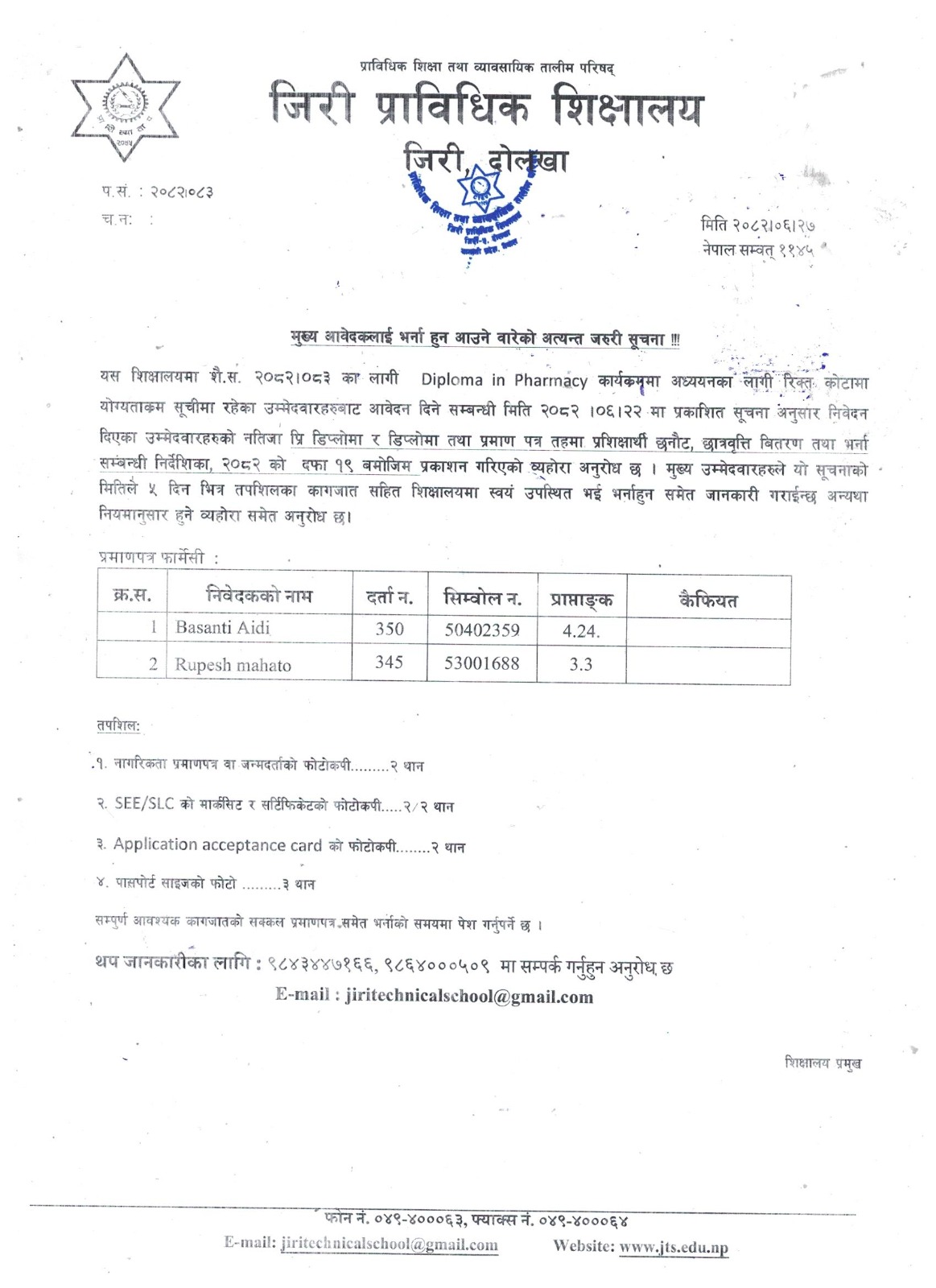 Diploma Pharmcay कार्यक्रममा भर्ना हुन आउने बारेको सूचना